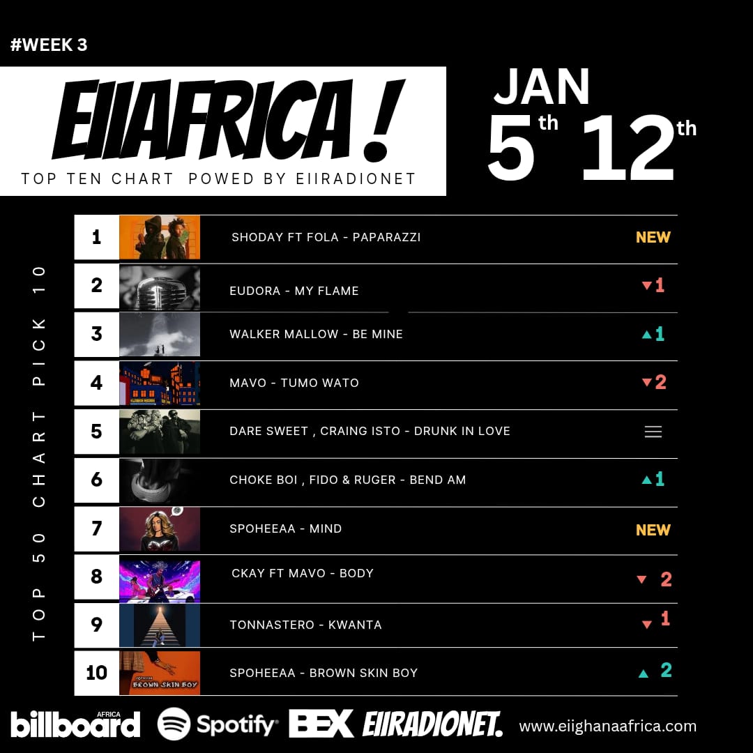 The EIIRAFRICA Official Chart is updated weekly and reflects radio airplay on EIIRADIONET, listener requests and voting, and digital traction across platforms.